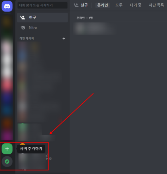 먼저 디스코드 접속을 하셔서 좌측 밑에 초록색+버튼이 있어요.