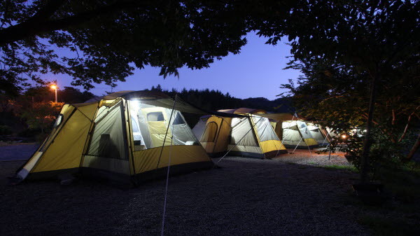 □(별이 넘쳐나는 캠핑장)~ 밤별캠핑장이 들어선 자리는 원래 밤나무 과수원이었다. 현재 캠핑장 주위에 있는 나무도 전부 밤나무다. 밤이면 산자락에 설치 해놓은 등마다 불이 들어와 그 모습이 마치 밤하늘의 별처럼 빛이 나서 밤별이란 호칭이 붙었다고 한다.