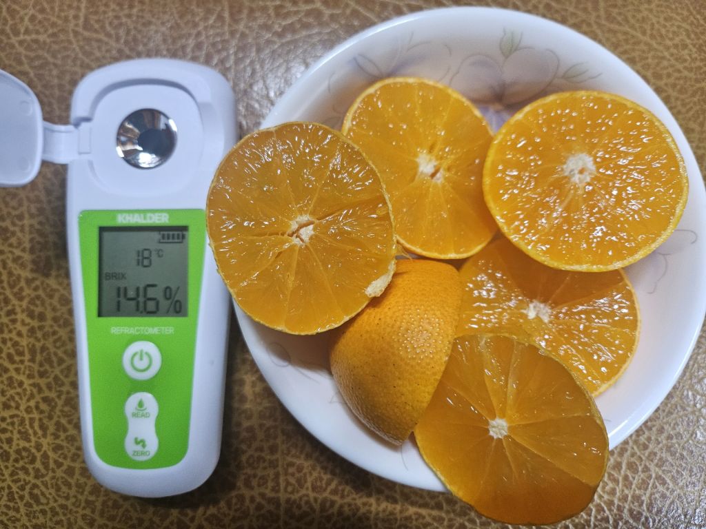 ㅡ갓 딴 황금향은 12.4브릭스가 나왔고 집안에서 3일정도 두었던 황금향은 사진에 나온 것 처럼 14브릭스가 나옴