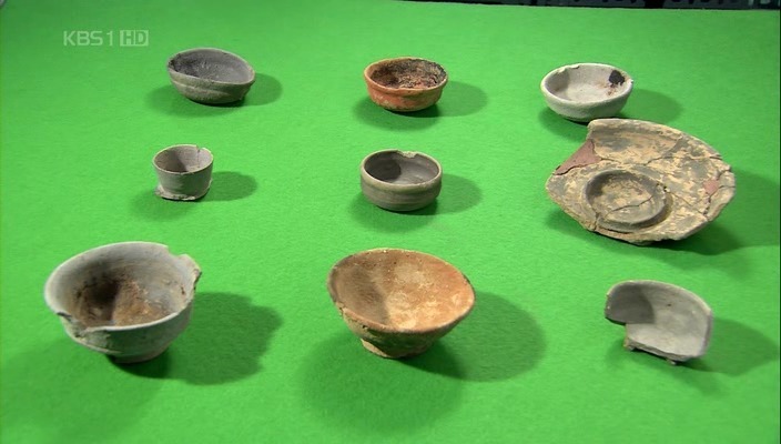 "지금 여기 보시는 유물들이 팔각 건물터에서 출토된 토기류입니다. 제사 관련 토기류로는 등잔, 잔, 잔받침 등이 있습니다."