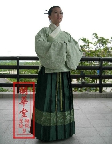 전통적으로 중국의 여성 복식은 치마를 윗옷 위에 입으며, 치마의 실루엣 또한 약간 끌리는 1자 형입니다.