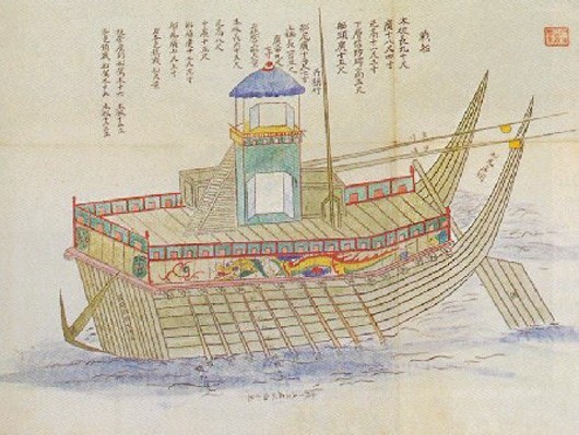 조선이 일본보다 월등히 앞선 군사기술은 선박 부문에도 있었다. 조선 전함은 하나의 두터운 판재로 외벽을 만들고 나무못으로 이어 붙이는 배였는데, 이것은 얇은 판재를 겹쳐 쓰며 쇠못을 사용하는 일본 배에 비해 무겁고 느린 편이었다. 그러나 나무못은 녹이 슬지 않고 같은 재질끼리 달라붙는 성질이 있었던 데 비해, 쇠못으로 여러 판재를 이은 일본 배는 충격을 받으면 이음새가 부서지면서 배가 파괴되기 쉬웠다. 그리고 기본 속도는 조선 배가 느렸지만, 회전은 보다 자유로워서 교전 중에 공격 방향을 빠르게 전환할 수 있었다. 또한 을묘왜변 이후 조선 초기의 맹선(猛船)을 개량하여 방패판과 상갑판을 올린 3층 구조의 판옥선(板屋船)을 만들었다. 이 배는 높이 때문에 적이 배로 뛰어오르기 어렵게 하고, 상층구조물로 적의 사격을 막는 한편 육중한 선체로 적선을 들이받아 깨트리며 총통을 배에 실어 적선을 부수거나 불태울 수 있어서 왜란 당시 조선 수군의 활약에 큰 기여를 했다. 이 판옥선에서 한 층을 축소하고 상갑판을 둥글게 덮어서 아군이 완전히 가려지도록 만든 것이 거북선이었다. 거북선은 적의 사격을 겁내지 않았으므로 적진 깊숙이 돌격해 진영을 깨트리는 돌격선으로 활약했지만, 판옥선보다 낮았기 때문에 판옥선처럼 위에서 아래로 사격할 수가 없어 주력 전선으로 쓰이지는 못했다.