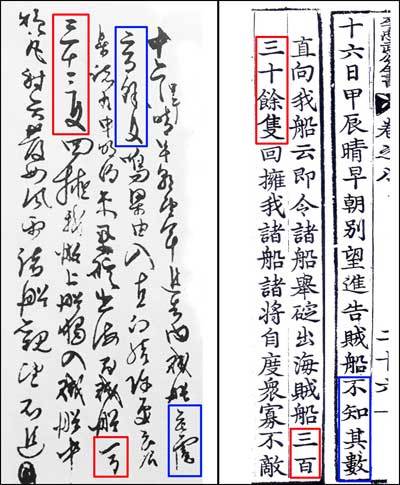 그림의 붉은색 부분에서와 같이, 명량해전이 일어났던 1597년 음력 9월 16일 이순신 장군은 친필로 “적선 133척(賊船一百三十三隻)”이라 썼는데, 정조 때의 정서체 간행관들은 “적선 330여척(三百三十餘隻)”으로 잘못 읽었다. 그리고 그 실수가 이번 명량 영화로 이어졌다. 영화 제작진들은 아마도 페르시아와 그리스 간의 살라미스 해전을 다룬 <300: 제국의 부활>을 경쟁작으로 의식한 때문인지, 정조 때 오판한 숫자 330을 채용, 정확한 고증에는 실패했다.