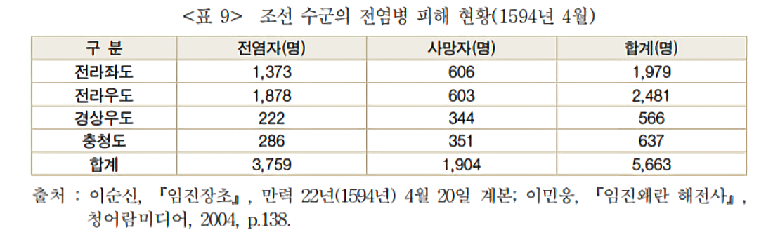 "진중의 군졸들이 태반이나 전염되어 사망자가 속출하고 있으며, 더구나 군량이 부족하여 계속 굶게 되고 굶던 끝에 병이 나면 반드시 죽게 되는지라, 군사의 정원은 매일 계속해서 줄어지니 다시 보충할 사람이 없을 뿐 아니라, 신이 거느린 수군만을 헤아려 보아도 사부와 격군을 아울러 원래의 수 6,200여 명 중에서 작년과 금년에 전사한 사람의 수와 2ㆍ3월부터 오늘에 이르기까지 병사자가 600여 명이나 되는데, 무릇 이들 사망자는 모두 건강하고 활을 자 쏘며 배도 잘 부리는 토병과 보자기들이오며, 겨우 남아있는 군졸들은 조석으로 먹는 것이 불과 2ㆍ3홉이라, 궁색하고 고달픔이 극도에 달하여 활을 당기고 노를 젓기에 도저히 감당할 수 없사옵니다." -만력 21년(1593) 8월 10일자 장계 중-