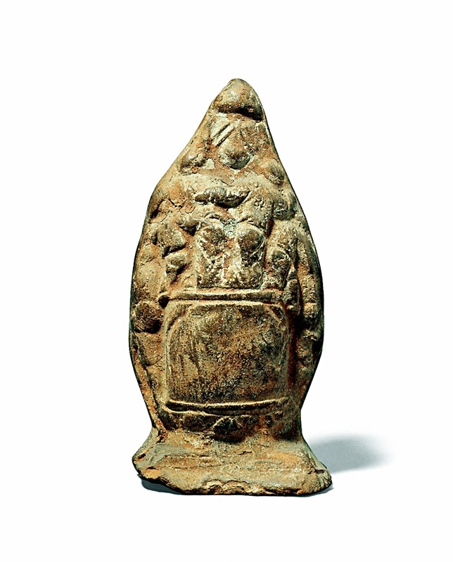 화형보관(花形寶冠)으로 머리를 장식한 여인이 손을 입에 물고 있는 어린 아이를 무릎 위로 안고 있는 형상이다.