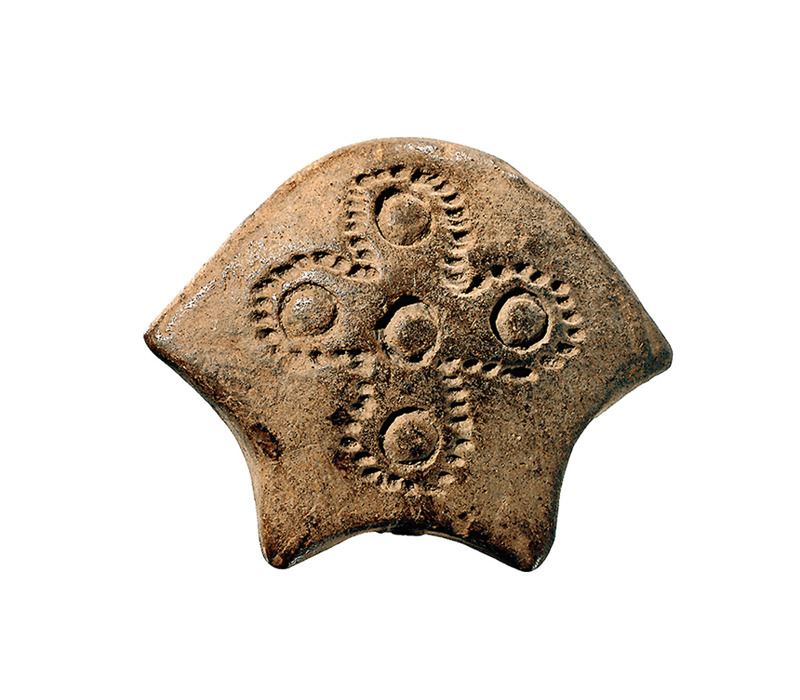 화살촉 모양의 장식 표면 위에 5개의 원을 상-하-좌-우 및 중앙에 찍어 놓아 십자모양을 형성하였고 그 주위로는 작은 점을 연속적으로 눌러찍어[押印] 십자무늬를 장식하였다.