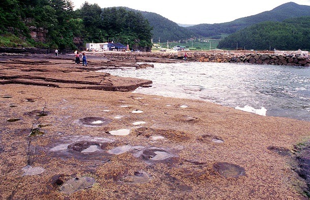 | 세계에서 공룡발자국 화석이 가장 밀집한 경남 고성군 덕명리의 해안가. 바닷물이 고인 둥근 자국이 약 1억년전 이곳을 지나던 공룡들의 흔적이다. |