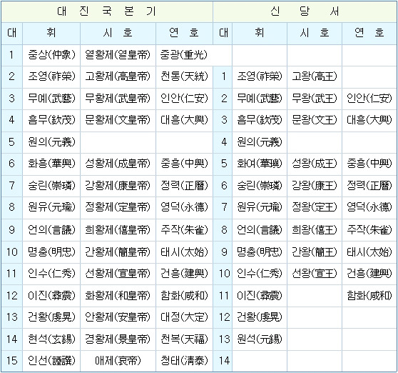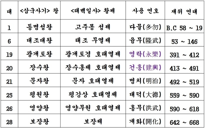 ② <고구리사초략>의 고구리 건원칭제 기록 <고구리사초략>에는 아래와 같이 8분 임금이 건원칭제를 했다는 기록이 남아 있다. 시조 추모대제(동명성왕) 동명(東明), 2세 광명대제(유리명왕) 광명(光明), 3세 대무신제 대무(大武), 6세 신명제 신명(神明), 19세 광개토대제 영락(永樂), 20세 장수대제 장수(長壽), 21세 명치대제(문자명왕) 명치(明治), 22세 안장대제 안장(安藏), 23세 안원대제 대장(大藏) ③ <태백일사>의 대진국(발해)의 건원칭제 기록 고구리 뿐만 아니라 그 정통성을 그대로 계승한 대조영이 세운 대진국(발해)도 건원칭제를 했던 황제국이었다. <태백일사 대진국본기>의 건원칭제 기록은 중국의 <신당서>에도 같은 연호가 기록되어 있다. 또한 1949년 중국 길림성 돈화에서 발견된 정혜공주 묘비와 1980년 중국 길림성 화룡현에서 발견된 정효공주 묘비명에 ‘대흥보력효감금륜성법대왕’(大興寶曆孝感金輪聖法大王)이라는 문구에서 4대 문황제(대흠무)의 연호가 ‘대흥(大興)’이었음이 명확하게 입증되었다. (http://www.skyedaily.com/news/news_view.html?ID=10909 참조)