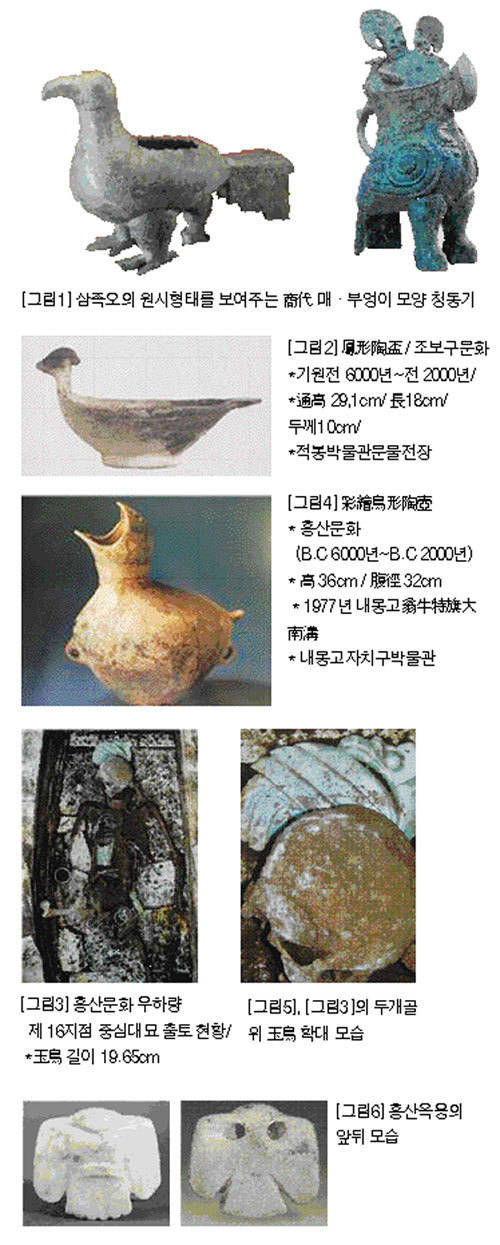 다시 말해 새 중의 왕자격인 솔개를 태양과 鳥日同體化함으로써 천신의 권능과 지령의 생식[卵生] 권능을 복합적으로 상징화했다. 그러므로 태양조는 처음부터 솔개였다. 이것이 東漢의 王充(A.D.27~A.D.약 97)의 『論衡』을 비롯한 儒者들의 문헌에서 삼족오로 기술되면서 訛誤돼 버렸던 것이다. 이에 대한 논증은 다음 호에 새 숭배의 원류에 대한 중국 고대의 문징과 함께 고대 한국의 새 숭배의 물징에서 상술하겠다.