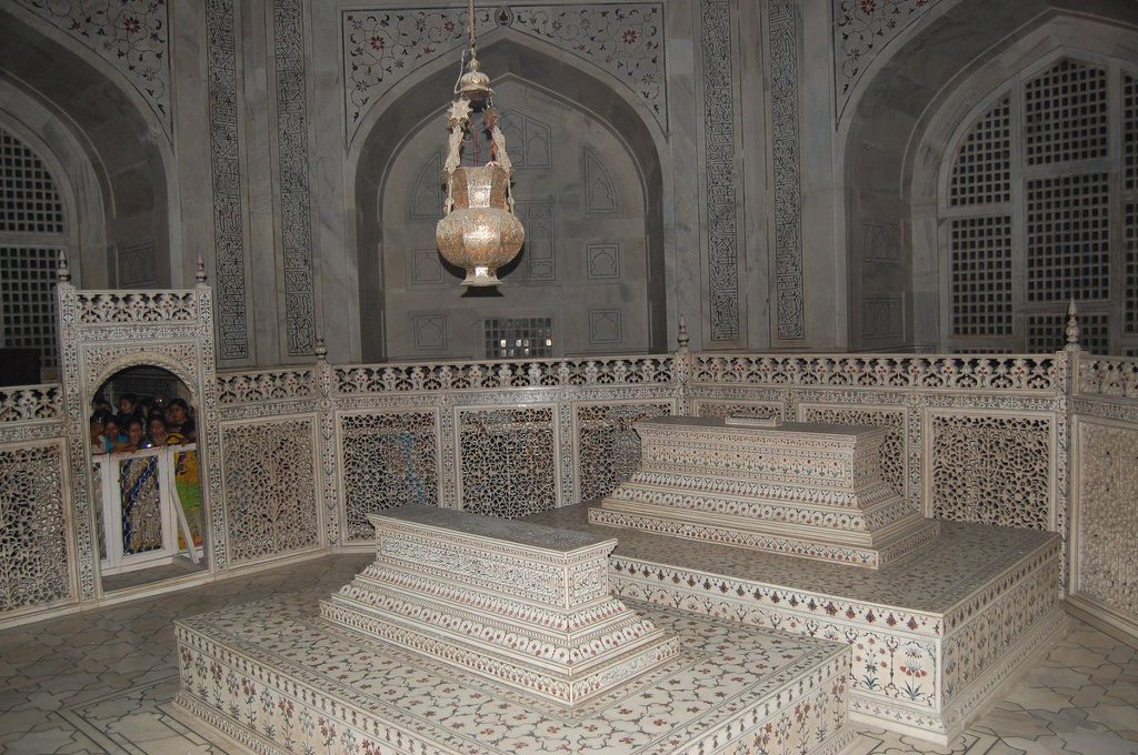 장인들의 숨결이 느껴지는 건물 안에는 가지각색의 돌로 아름답게 꾸며진 묘가 있어요. 건물이 완성될 당시에는 뭄타즈 마할의 묘만 있었지만 현재는 샤 자한 황제와 뭄타즈 마할이 함께 잠들어 있습니다. 물론 화려하고 우아한 꽃으로 장식된 관은 모형이고, 실제 시신은 타지마할의 지하에 있어요. 황제와 왕비가 잠들어 있는 묘지 주변은 나지막한 칸막이가 둘려 있어 묘지 안으로 들어갈 수는 없답니다.