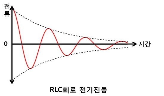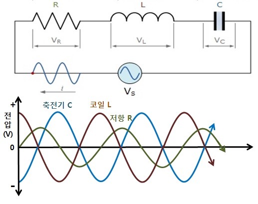 <RLC회로의 전압에 따른 전류(량), 정상 전류는 저항과 같은 파장영역 임>