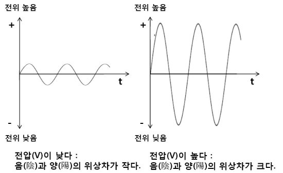 기전력(전압,V)이 크고 전류량(A)도 많으면 전력(W)도 큰데, 전압(V)×전류(A)=전력(W)이 됩니다. 따라서 전압(V)은 음(陰,-)과 양(陽,+)의 위상차이고, 전류(A)는 이러한 위상차의 흐름(이동량)입니다.