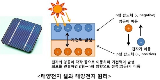 3. 태양전지 : 태양의 '빛 에너지(광전효과)'를 통해 전기에너지를 생산합니다. p형반도체와 n형반도체가 있는데, 태양 빛을 비추면 전자(-)와 양공(+)이 각각 p형반도체와 n형반도체에 의해 분리되어 각자의 전극으로 이동하면서 이러한 음(-)과 양(+)의 위상차(기전력)로 인해 전기에너지가 발생합니다.