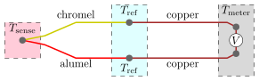 <열전대 - 크롬합금과 니켈·알루미늄합금 두 종류의 금속 A, B를 접합하고, 양 접점의 온도를 달리하면 온도차에 비례하여 열기전력이 발생(여기서 양 접점이란 Tsense와 Tmeter, Tmeter의 전압계에서 두 금속에 다른 성질에 의해 전하의 위상차가 발생)>