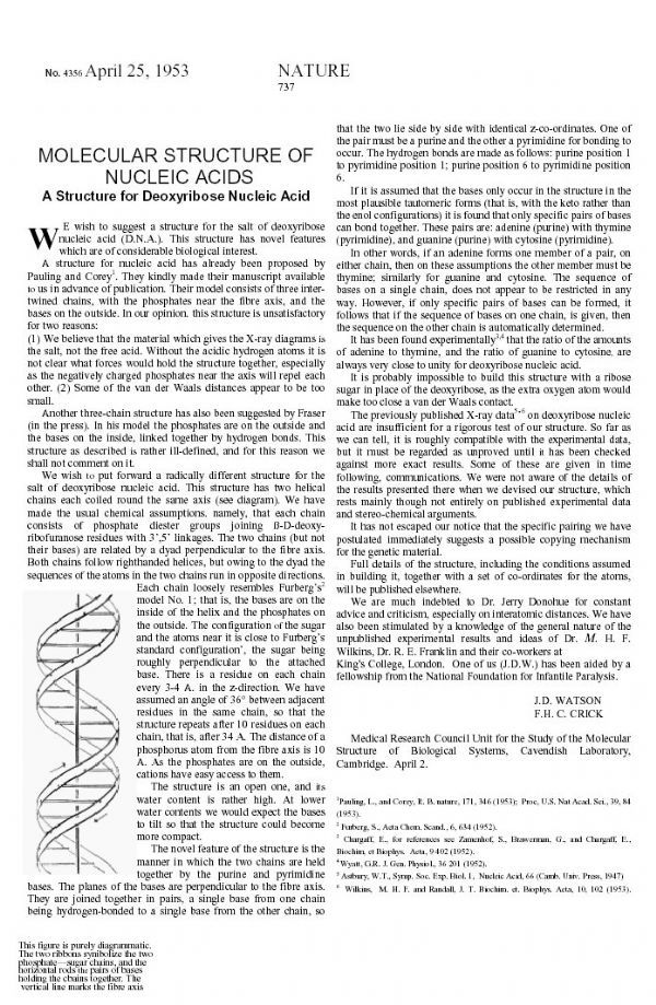 ▲ 왓슨과 크릭의 논문이 게재된 1953년 4월25일자 네이처지.(1장 짜리 논문)