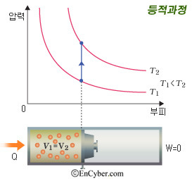 셋째, 등적과정이다. 열역학 제1법칙 E = Q - W 에서 W = 0인 경우이다. 즉 부피가 일정하다. 계가 열을 흡수하면 계의 내부에너지는 증가하고, 반대로 열을 잃으면 내부에너지가 감소한다.