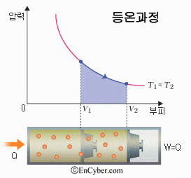 넷째, 등온 과정이다. 온도를 일정하게 유지하고 압력과 부피를 변화시키는 과정으로, 열역학 제1법칙 E = Q - W 에서 E = 0인 경우이다. 따라서 Q = W가된다.