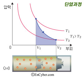 첫째, 단열 팽창 또는 단열 압축 과정이다. 열역학 제1법칙 E = Q - W 에서 Q = 0인 경우이다. 즉 외부로부터 열의 출입이 없는 경우이다. 그러면 E = -W가된다. 이는 외부와 열에너지 전달이 일어나지 않는 과정이다. 계(System)가 일을 하면 내부에너지는 그만큼 감소하고, 반대로 계가 외부로부터 일을 받으면 내부에너지는 그만큼 증가한다.