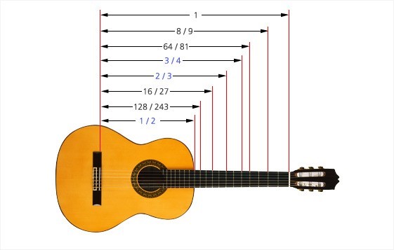 예를 들어 흔히 볼 수 있는 기타에서 기타줄의 3/4, 2/3, 1/2, ...등의 비를 갖는 곳쯤에 프렛(fret, 핑거보드에 붙여 놓은 금속조각)이 있음을 볼 수 있다. (나중에 설명하겠지만, 정확히 3/4이라는 것은 아니다.) 이 지점에 기타줄이 닿도록 하여 줄을 튕기면, 운지하지 않을 때(개방현일 때) 나는 소리보다 4도, 5도, 8도(옥타브) 높은 소리가 난다는 뜻이다.