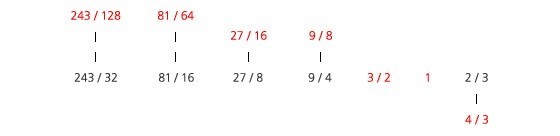 앞서 C와 D 사이나, D와 E 사이처럼 온음이었던 구간에 파란색으로 쓴 비율이 하나씩 들어가다가, F와 G 사이에 두 개의 비율을 집어 넣어야 하므로 다소 불합리해진다. 더구나 729/512=1.4238…과, 1024/729=1.4046…의 값은 상당히 가까워 그다지 차이를 느낄 수 없다. 따라서 이쯤에서 합리적으로 타협을 하여, 1024/729를 버리고 729/512만을 취해 늘어쓰면 다음과 같다.