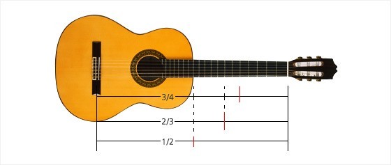 ▲ 기타의 그림.기타 줄의 양 끝을 기준으로 대략 3/4, 2/3, 1/2, ... 등의 지점에프렛이 있음을 알 수 있다.