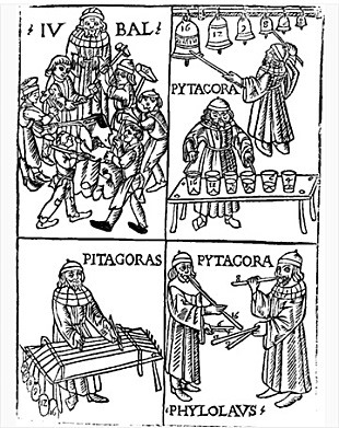 가장 유명한 기록이라 할 수 있는 것은 6세기 초의 철학자 보에티우스(Boethius, 470?~524)의 기록인데, 이에 따르면 피타고라스가 신의 안내를 받아 대장간 옆을 지나는데 듣기에 좋은 어울리는 소리가 들렸다고 한다. 그래서 알아보았더니 망치의 무게 사이에 6:8:9:12의 정수비가 성립했다는 것이다.
