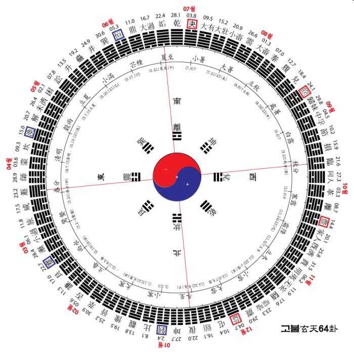앞으로는 고불 玄天64괘로만 易을 해석하데 시계방향으로 陽이 夏至를 거쳐 極에 도달한 乾(正午 혹은 한 여름)卦를 지나자 一陰이 생겨나는 澤天夬卦로 나아가 陰이 점점 증가하게 되고, 陰이 冬至를 지나 極에 도달한 坤(子正 혹은 한 겨울)卦를 지나자 一陽이 생겨나는 山地剝卦로 나아가 陽이 점점 증가하게 된다.(지금까지의 모든 易은 반대로 해석하니 64괘의 本文해석과 맞지 않으므로 그 과정을 꿰맞추어 놓은 것이다. )는 것을 알면 本文의 해석과 저절로 일치하게 됨을 알 수 있을 것이다.