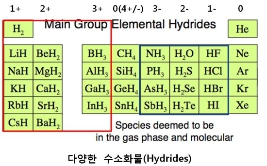 수소화물은 수소가 서로 또는 다른 원소들과 결합하는 것인데, 사실 다른 결합과는 다른 좀 특이한 결합입니다. 왜냐하면 다른 원소들은 서로 결합하여 최외곽전자수를 8개로 만들려고 하는데, 수소화물의 수소결합은 꼭 그렇지않기 때문입니다.