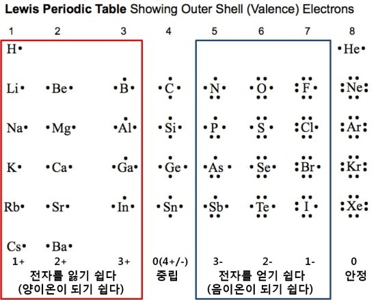 옥텟규칙(octet rule)은 모든 원소는 최외곽전자(원자가전자수)의 수가 8개(1주기 2개)일때 가장 안정하다는 규칙입니다. 따라서 원소들은 전자가 1개일때는 전자를 1개 잃어서 최외곽전자수를 8개(1주기 2개)를 맞추려고 합니다. 이렇게 옥텟규칙을 위해서는 원소들은 양이온(+) 또는 음이온(-) 상태가 되거나, 이를 통해 각각 원자결합하는 것입니다. 양이온(+)들끼리 혹은 음이온(-)들끼리 전자를 8개 공유하는 것을 보통 공유결합, 양이온(+)과 음이온(-)이 전자를 8개 공유하는 것을 보통 이온결합이라고 합니다.