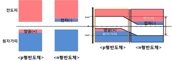 순수 반도체는 열과 빛에너지를 받더라도 에너지띠의 전자(-)와 양공(+)이 균일하게 움직이므로 전기적인 성질에 영향을 주지 않습니다. 하지만 불순물을 첨가하는 도핑 작업을하게 되면 전기적인 성질이 나타나며, 불순물의 양이 많아지면 전도율이 10억배이상 증가합니다.