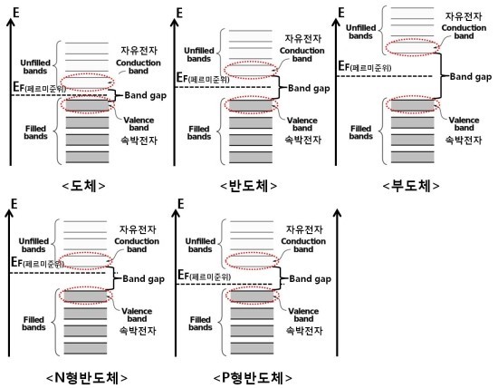 전자가 발견될 확률은 페르미에너지(페르미준위)를 기준으로 도체, 반도체, p형반도체, n형반도체, 부도체 등으로 에너지밴드갭(띠틈)의 형태에 따라 달라지기도 하는데, 반도체에서 불순물을 첨가하여 이러한 물질의 성질을 변화시킵니다.