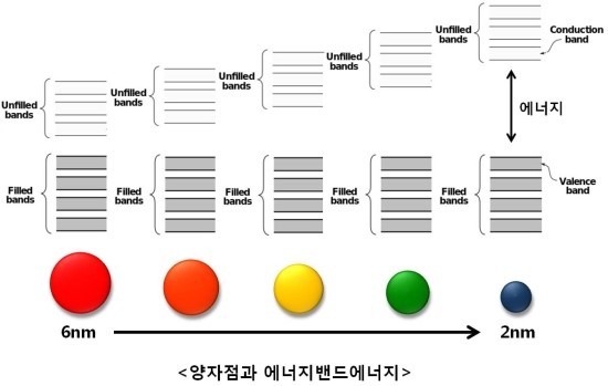 같은 화합물이라도 크기에 따라 에너지밴드영역과 이에따른 가시광선의 파장이 다릅니다. 특히 양자점은 반도체화합물로서 크기가 작아질수록 파장이 짧은 빛을 냅니다. 이때 진동수가 빨라지고 에너지의 세기도 커집니다.