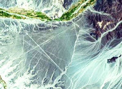 ▲ 상공 600km에서 인공위성으로 촬영한 나즈카 평원. 착륙선이 선명하게 보인다