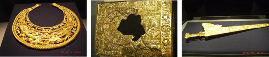 ②스키타이인들은 황금을 숭배 대상으로 하여 카자흐스탄과 신장 위구르 북부지역에서 스키타이인들의 금동기구들이 다수 출토되었다. 이들 기구는 금박을 두들겨 만드는 경우가 많았다. 스키타이의 황금문화는 잘 알려져 있다. 지난해 서울에서도 스키타이 황금 문명전이 열린 바 있다. 이후의 아시아 유목국가들도 황금문명의 전통을 이어온 것 같다. 몽골 국립박물관에서는 흉노·돌궐로 이어지는 황금장식유물을 볼 수 있다.