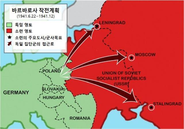 동쪽의 땅과 물자(곡창·유전·지하자원)가 필요했다. 이를 위해 ‘바르바로사(Barbarossa) 작전’이 입안됐다. 독일군은 북부·중앙·남부의