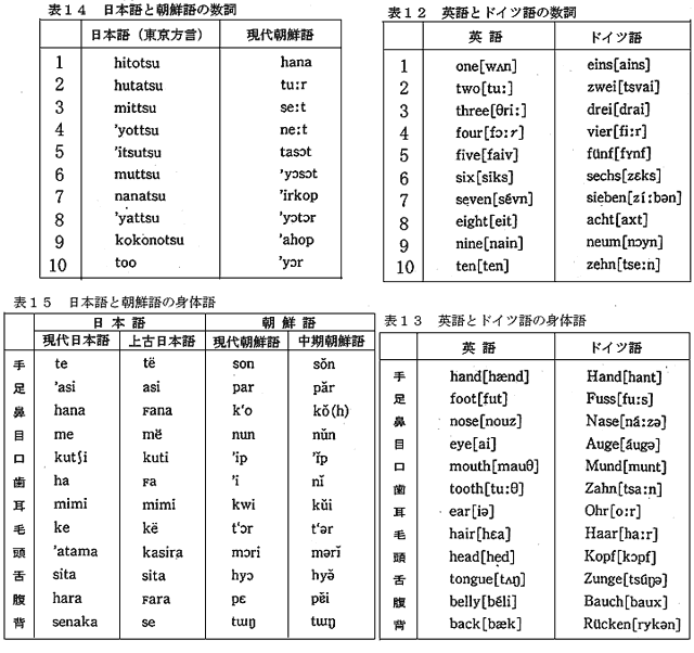 일본어는 문법이 같고 몇몇 고유어가 한국어와 비슷하게 느껴지지만 비교언어학의 기초가 되는 숫자나 신체 어휘를 보면 완전 다른계통이다. 표에서 같은 계통이라 말해지는 영어와 독일어의 차이를 보고 한국어와 일본어의 신체어휘를 비교하면 납득할만 하다.
