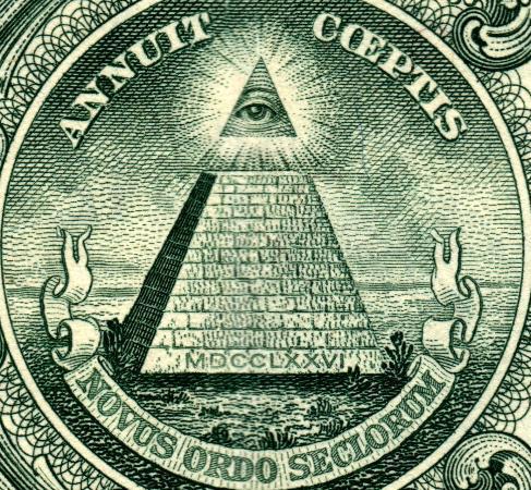 일루미나티 유대인이 소유한 민간기업 연방준비은행에서 발행한 1달라 지폐 뒷면에는 피라미드 꼭데기에 빛을 발하는 전시안이 있는데, 이는 일루미나티가 지배하는 세상, 즉 신세계질서에 의한 세계정부를 만들어 모든 사람을 지배하겠다는 뜻입니다.