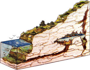 ▲ 코스케 동굴 단면. 입구는 수면으로부터 37m 아래 있으며, 175m 길이의 긴 해저 동굴을 지나면 도달할 수 있다. 사진 출처 http://www.lavisitedescalanques.com/uk/grand-public/calanques.php