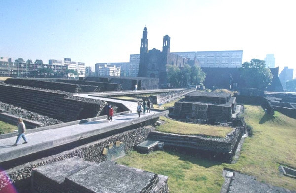 뒷쪽으로 현대적 아파트가 보이는 산띠아고 교회는 원래 창고로 사용하던 곳으로 현대에 와서 성당으로 사용되고 있다. 교회 뒤쪽으로 틀라텔롤코의 삼문화(三文化)광장 유적이 있다. 삼문화(三文化)광장(Plaza de las Tres Culturas)dms 아스타크유적, 스페인 식민시대의 교회, 외무부로 쓰이는 현대식빌딩으로 구성된 고대,중세,현대의 3가지 문화가 공존하는 문화의 다양성의 특징에서 일컫는 말이다. 이 지역은 아스테크인드이 스페인의 코르테스를 상대로 최후까지 저항하던 무너진 곳으로 350년이 지난 1968년 올림픽을 며칠 앞둔 10월 2일 올림픽 개최를 반대하는 학생과 군경의 유형 충돌로 백여 명의 학생들이 꽃다운 목숨을 잃은 곳으로 더 유명하다. 해마다 이 날은 기념하여 학생들이 행진을 한다. 뜰라뗄로꼬는 1331년 떼노시띠뜰란에 이어 아스떼까의 제 2의 도시로서 세워져 쌍둥이 도시라고 불려졌으나 이미 그 이전부터 중앙아메리카 최대의 물류유통 센터였던 대규모의 시장이었다. 뜰라뗄로꼬 유적지는 아스떼까의 주신 위씰로뽀시뜰리와 뜰라록에 봉헌된 두 개의 신전과 두 개의 겹쳐진 피라미드가 남아 있다. 식민지 시대의 성당인 싼띠아고 성당은 이 신전의 돌을 가져다 지은 것이다. 이 주변은 1985년 대지진 당시 가장 피해가 많은 지역이었다고 한다