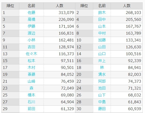 위의 도표가 1위부터 30위까지의 일본 성씨인데..