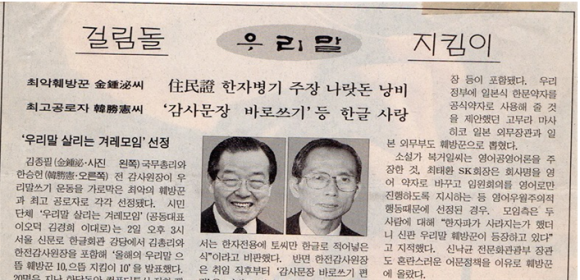 1999년 한글날에 우리말살리는겨레모임이 한 ”우리말 지킴이와 훼방꾼“을 발표한 보도 기사.