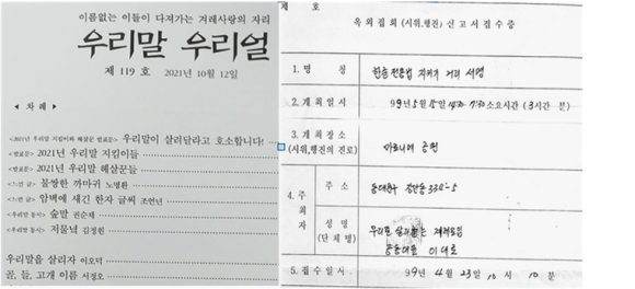 이오덕 선생이 중요하게 생각한 회보 ”우리말 우리얼“과 우리 모임이 1999년 한글전용법 지키기 거리 서명을 할 때 종로경찰서에 낸 집회 신고서 접수증(오른쪽)