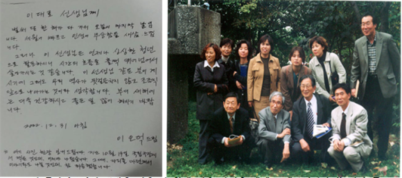 2002년 문화부로부터 훈장을 받은 날 함께 찍은 사진을 내게 보내주시면서 쓴 편지 글.