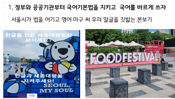 우리는 1970년대 “한글사랑 나라사랑, 우리도 한번 잘 살아보자!”고 우리말로 외치면서 한마음으로 뭉쳐 나라가 빨리 일으켰다. 오늘 다시 세종정신과 우리말글을 사랑하는 마음으로 뭉쳐서 우리말과 겨레 얼을 살리고 빛내어 나라를 일으킬 것을 다짐한다. 일찍이 주시경 선생이 “나라말이 오르면 나라도 오르고 나라말이 내리면 나라도 내린다.”고 말씀하시며 우리 말글을 지키고 빛낸 그 뜻을 이어받아 우리말글 위기를 넘길 것을 밝힌다. 이재명 정부는 우리 뜻을 받아들여서 나라 말글을 지키고 살리는데 힘쓰고 우리 말글 사랑정신으로 국민통합을 이루기 바란다. 말글살이가 어지럽고 국민정신이 흔들리니 사회통합이 안 된다. 우리 한글을 만들고 자주정신을 살린 세종대왕 때와 1970년대 한글을 살리고 빛낸 박정희 정부 때 나라가 가장 빨리 일어난 역사되새기기 바란다!