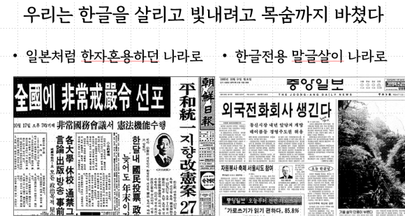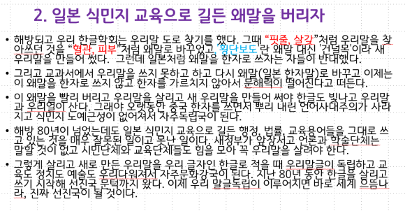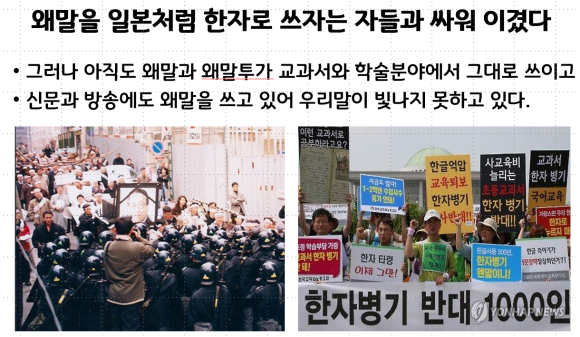 그래서 우리는 대한민국 건국 뒤에도 그들과 50여 년 동안 문자전쟁을 했다. 그들이 정치인, 학자, 언론인, 교육자로 이 나라를 지배하고 한글과 한글학회를 못살게 굴었기 때문이다. 일제 강점기보다도 대한민국 때에 한글과 한글을 살리고 빛내려는 사람들은 천대를 받고 멸시를 당했다, 그들은 교과서에서 살려 쓰던 우리 토박이말을 다시 왜말로 바꾸고 글과 한글학회를 못살게 굴더니 한글과 싸움에서 한자가 지니까 영어 섬기기로 바뀌었다. 그러니 간신히 한글나라가 자리 잡으려는 나라가 다시 영어 식민지가 될 판이다. 수천 년 중국 한자와 문화를 섬기면서 길든 사대주의와 일본 식민지 국민교육으로 길든 노예근성이 우리말과 우리 자주정신을 짓밟는 것이다.