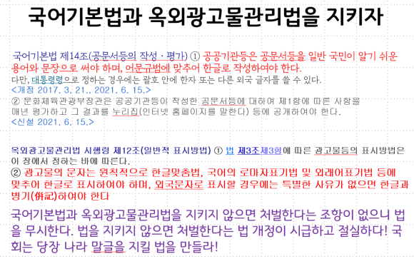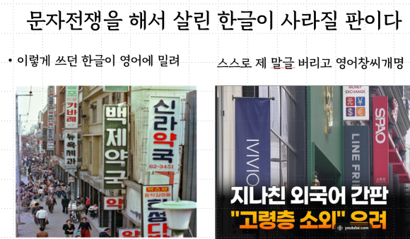 조선이 세계에서 가장 좋은 제 글자를 푸대접하고 유교 성리학에 빠져서 세종정신을 못살게 하며 당파싸움만 하다가 조선이 망했는데 대한민국 시대에 서양 종교와 외세에 빠진 자들이 우리 자주정신을 짓밟아 국론이 좌우로 갈려서 당파싸움에 아까운 나라 힘과 시간을 써버리고 있다. 일제 식민지 때 일본이 우리 민족혼을 말살하려고 강제로 일본식 창씨개명을 했는데 오늘날 대한민국 사람들은 스스로 민족뿌리를 저버리려고 영어 창씨개명을 하고 있다. 그래서 1970년대 간신히 한글을 살려서 거리에는 한글간판이 가득했는데 요즘은 영어 간판이 가득하다. 정조 때 실학파란 자들이 중국어를 공용어로 하자고 했는데 오늘날 얼빠진 자들이 영어를 공용어로 하자면서 정부 조직 명칭까지 영어로 짓고 있다. 조선시대 제 말글을 거들떠보지 않고 짓밟아 나라 망친 역사를 되풀이 하고 있다.
