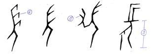 長(긴 장)의 갑골문 자형은 머리에 특별한 장식을 하고 있는 사람의 형상인데, 이 장식이란 새의 꽁지깃을 표현한 것입니다[⑥]. 세 번째 자형의 ⑦부분은 손동작을 강조하고 있는데, 이는‘지휘하다’의 뜻이며, 네 번째 자형의 ⑤부분은 老(늙을 로)자입니다.