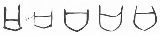 의 갑골문 및 전문은 U 자 모양의 안을 하나의 획이 가로지르는 모양입니다. 두 획이 접합되는 모양은 우로 돌출되게 하고 있는데, 이는 , 등의 다른 글자들과 구분을 위한 것입니다.