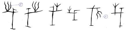 哉[-口](다칠 재)의 갑골문2은 戈의 돌출된 날 부분에 어떤 구조물의 모양으로 才[①]를 올려놓고 있으나, 갑골문1에서는 윗부분이 풀어진 세 가닥의 선[②]으로 되어 있으며, 아래쪽으로 향하고 있기도 합니다[③].