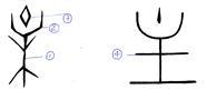 主의 갑골문은 木[①]의 상부에 받침대 모양의 구조물[②]이 얹혀 있으며, 그 속에 마름모꼴의 기호[③]가 있는 모양이며, 전문 자형은 갑골문의 木이 土[④]로 변경되어 있습니다.
